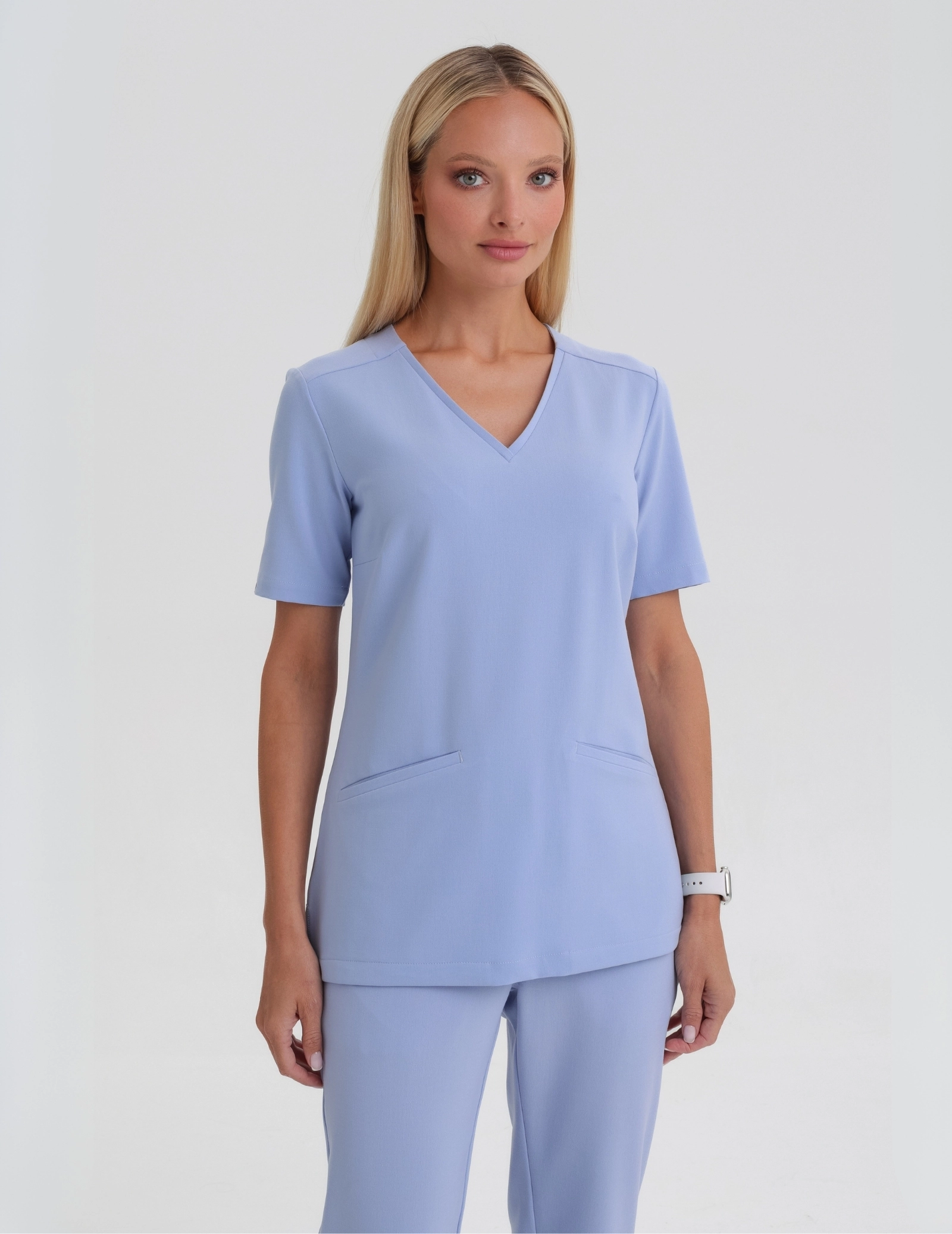 Fitted medical scrub top that beautifully accentuates the neckline, neck, and shoulders. Side slits enhance comfort.