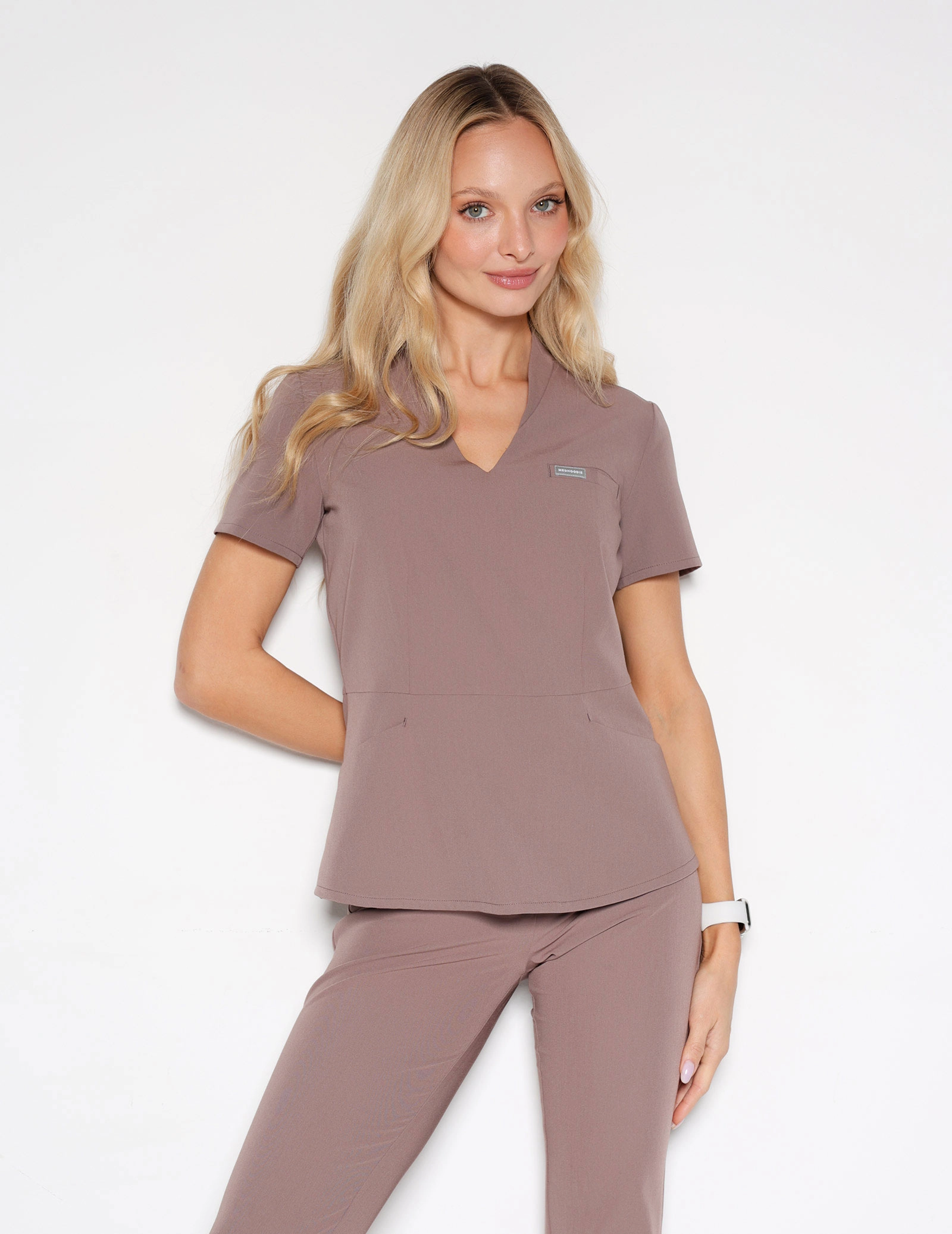 Slim and feminine medical scrub top accentuating the waist. Features a delicate peplum and three pockets, including two large enough to hold a phone. A modern V-neck and well-tailored fit provide all-day comfort.